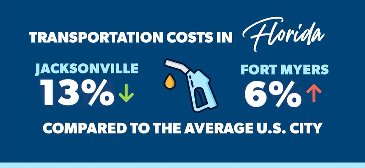 Rev up your engines! Florida transportation costs range from 13% lower than the national average in Jacksonville to 6% higher in Fort Myers.